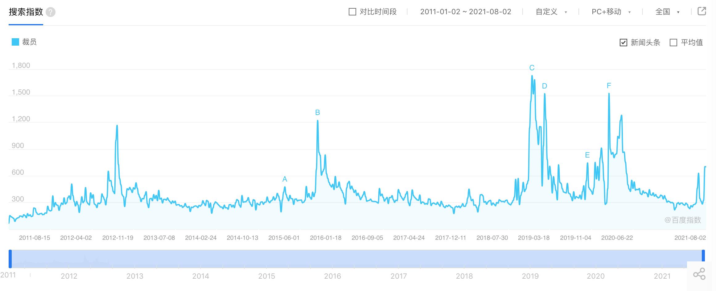 从2010年开始,中国共经历了4次大的裁员潮:2012年全球范围电子、金融等行业大裁员,2016年的O2O裁员潮,2019年的互联网裁员潮,2020年的疫情裁员潮。