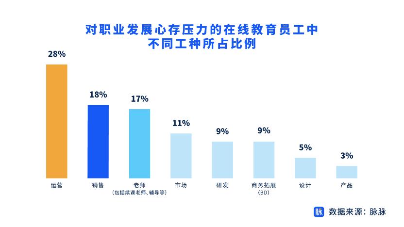 来自职场社交平台脉脉的数据显示,2021年5月,“双减”政策正式出台前,教培行业从业者表达过“强烈求职意愿”的人数与同年1月相比增长了33%,运营、销售、教培老师是未来职业发展压力最大的三个岗位。