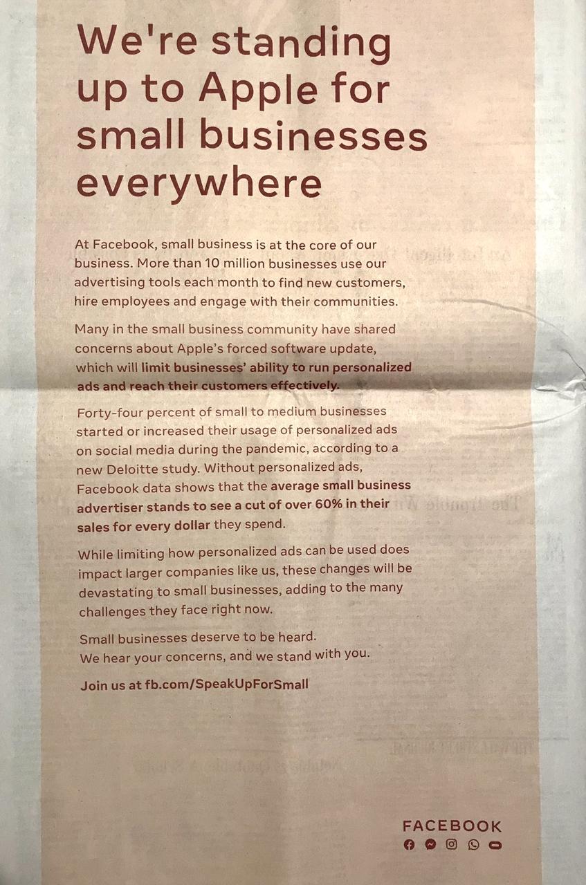 但对于所有以线上广告为商业模式的公司来说,这可能是一场性命攸关的大震荡。反应最激烈的是 Facebook。2020 年 12 月,它买了下了《纽约时报》的一整个版面,公开反对苹果。