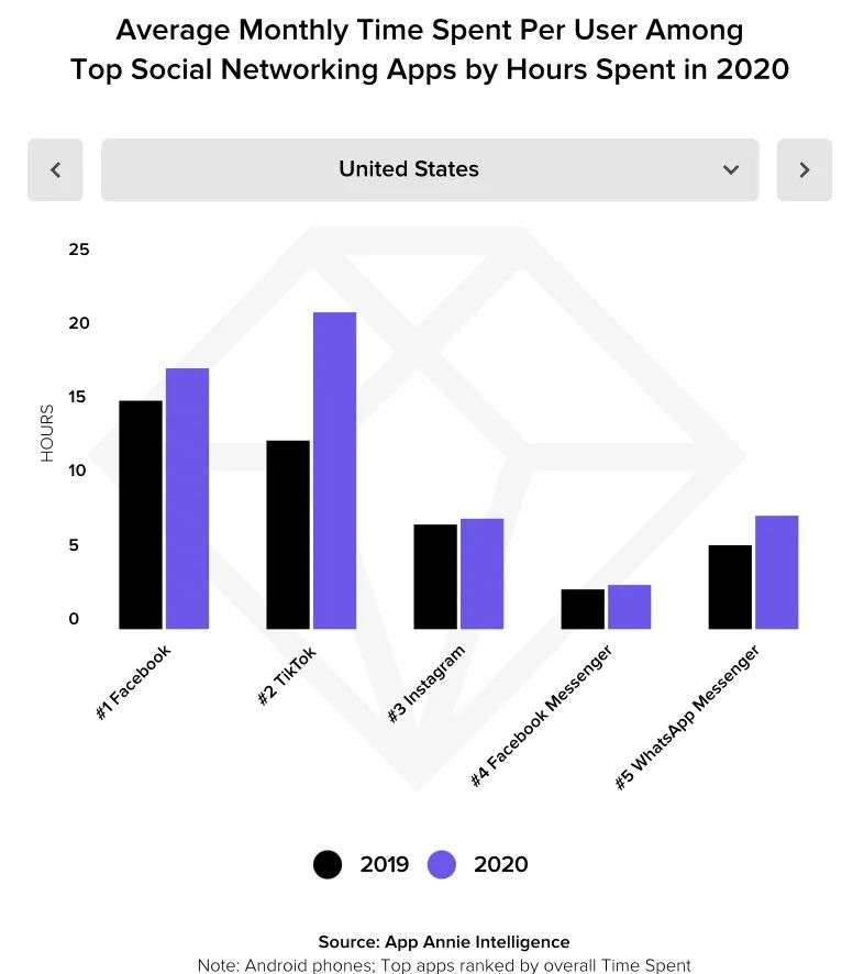 此外,TikTok用户平均每月逗留时间也在去年继续增长,超过了19.6个小时(App Annie统计数据),更是超过了Facebook(16.6个小时)。竞争对手不但没有崩溃,反而还在加速增长,甚至部分超越了自己,这无疑给扎克伯格带来了更大的刺激。
