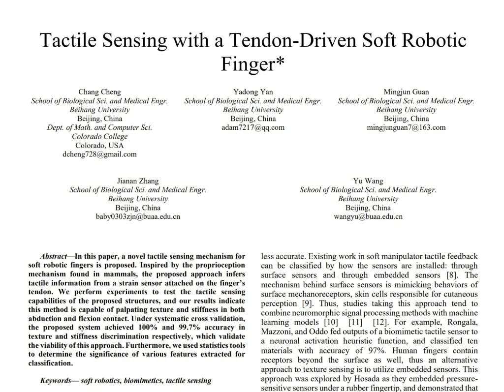 该研究已在论文预印本发布平台arXiv上预发表,论文题目为《用肌腱驱动的软机器人手指进行触觉感知(Tactile Sensing with a Tendon-Driven Soft Robotic Finger)》