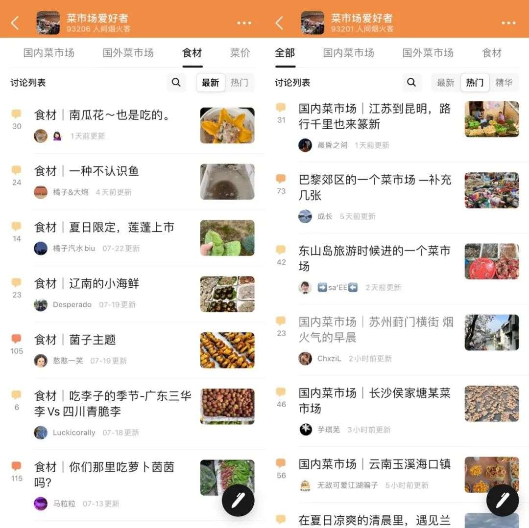 在书影音社区豆瓣上,有一个名为“菜市场爱好者”的小组,目前已有9万多个“人间烟火客”(小组成员名称)。网友们会在组内分享自己拍到的国内外菜市场朴实粗糙的美好,交流各种新奇的、不认识的、亦或是不知道怎么吃的食材。