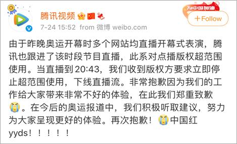 次日,腾讯视频通过官方微博做出回应,表示系因版权方原因而停止直播。