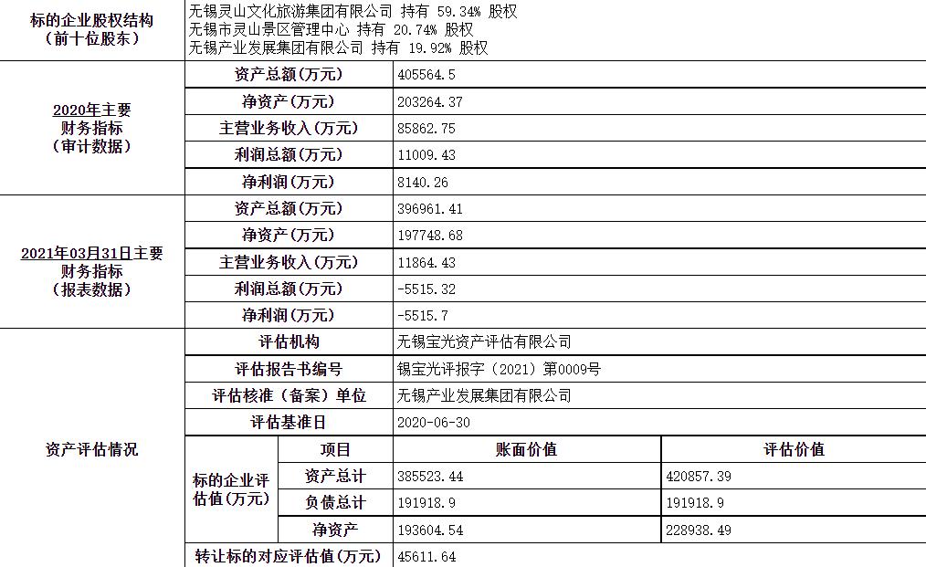 据挂牌文件披露数据显示,无锡拈花湾文化投资发展有限公司截至2020年末营业收入8.58亿元,净利润8140万元。2021年一季度收入1.18亿元,净亏损5515万元。