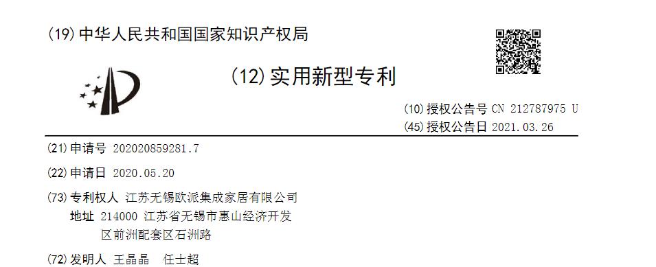 在国家知识产权局查询找了一则欧派申请的名为“一种自吸收甲醛的净味家具板材”的实用新型专利,注意这只是一个实用新型专利。