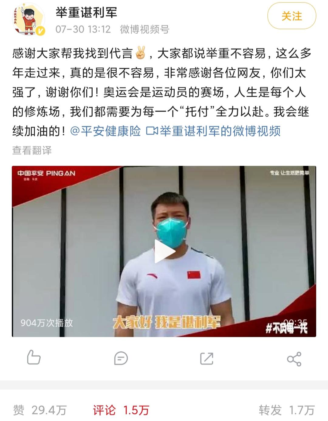 或许是网友的力量,也或许是运动员的魅力,在“求代言”后没两天,中国平安旗下的平安健康险就官宣谌利军为品牌健康大使。当天,谌利军发了一条微博感谢网友后,“谌利军感谢大家帮他找代言”的话题也是快速登上了热搜。但我相信,就像该条微博评论底下网友的留言“你值得”一样,运动员值得!而我也因此沾沾自喜,觉得这也有我自己贡献的一点点力量。
