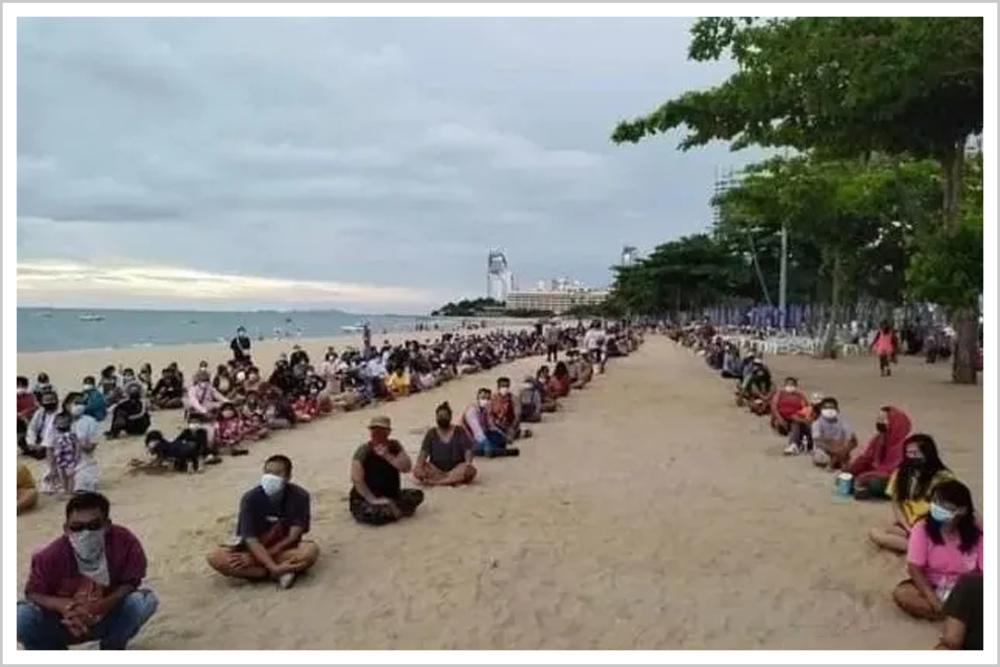 7月4日,数千名泰国失业者整齐划一地盘腿坐在芭提雅海滩。受疫情影响,大量店铺关闭,他们没有工作,只能坐在海滩等待好心人的施舍。