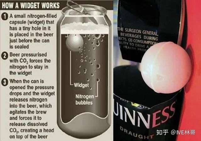 1969年,健力士又发明出一个释放氮气的小装置。一个表面有小孔的充氮小球可以在打开啤酒易拉罐的同时释放出氮气,令啤酒获得涌动的气泡效果。这项发明在1972年获得专利。如今,在进口超市货架上的健力士拉环底下,都藏着这样一个特殊的氮气球,看到它,你会想起50年前那项脑洞大开的发明吗?