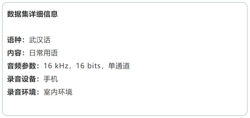 此数据集包含了5.08小时的武汉话朗读音频和转写文本,内容为日常用语。共有5,082条语料,由4名说话人提供。