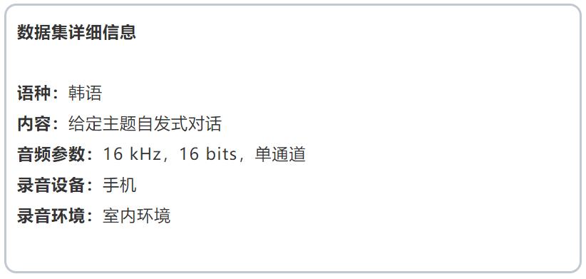 开源的数据包含了5.22个小时的韩语对话音频和转写文本,内容为7组说话人之间的22组给定主题对话。