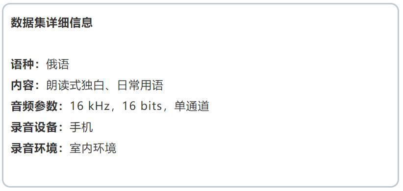 数据集总时长为6.57小时的俄语朗读音频和转写文本,内容为日常用语。共有3,842条语料,由10名说话人提供。