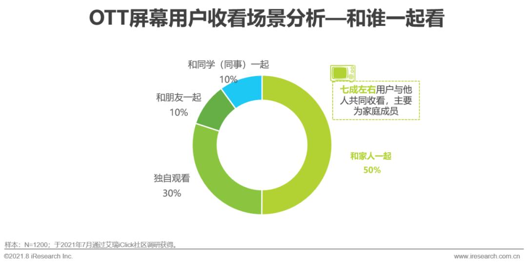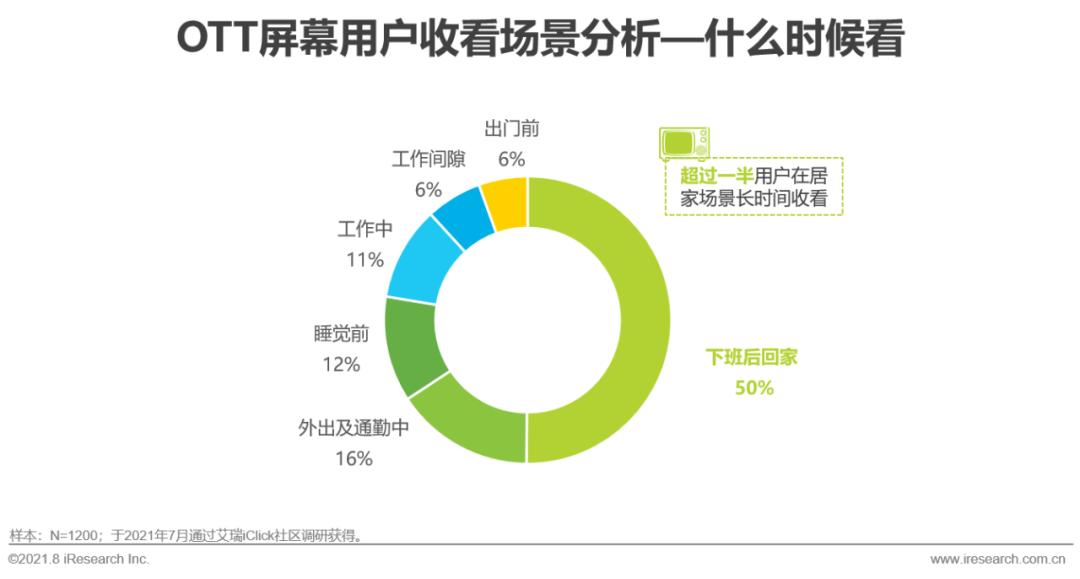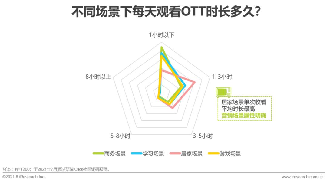 相较于商务场景、学习场景、游戏场景,OTT用户的使用场景主要为居家场景,并且大部分用户每天在居家环境下的收看时间在一小时以上,很大程度上超过了在其他场景下的使用时间,用户的收看时段也主要集中在下班后回家,这体现了OTT屏幕与居家场景和休闲时段的高度重合,因此OTT屏幕广告与家庭场景营销的关系密不可分。同时,OTT屏幕的使用通常是多人场景,多数用户都与他人共同收看,且主要为家庭成员,因此OTT屏幕广告更加侧重家庭消费人群,营销场景属性明确,其营销价值也更多应用在与家庭消费相关的产品上。