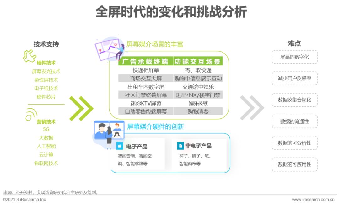 伴随屏幕硬件技术和营销技术的发展,未来屏幕媒介场景将进一步丰富,同时也会出现更多创新型的屏幕媒介,未来用户所处的各个场景都将有更多新型屏幕来承载广告,我们将逐渐进入全屏时代。虽然屏幕载体和场景的增多可以便利用户并为营销提供更多触点,但也面临着屏幕数字化改造、用户反感率、数据收集合规、数据流通、分析和应用等难点。在跨屏融合加速的趋势下,营销服务商和广告主将加速布局场景化营销,并围绕“媒体资源、技术能力、创意玩法”等展开对不同屏幕的生态建设,建设多屏生态,完善全链路营销。