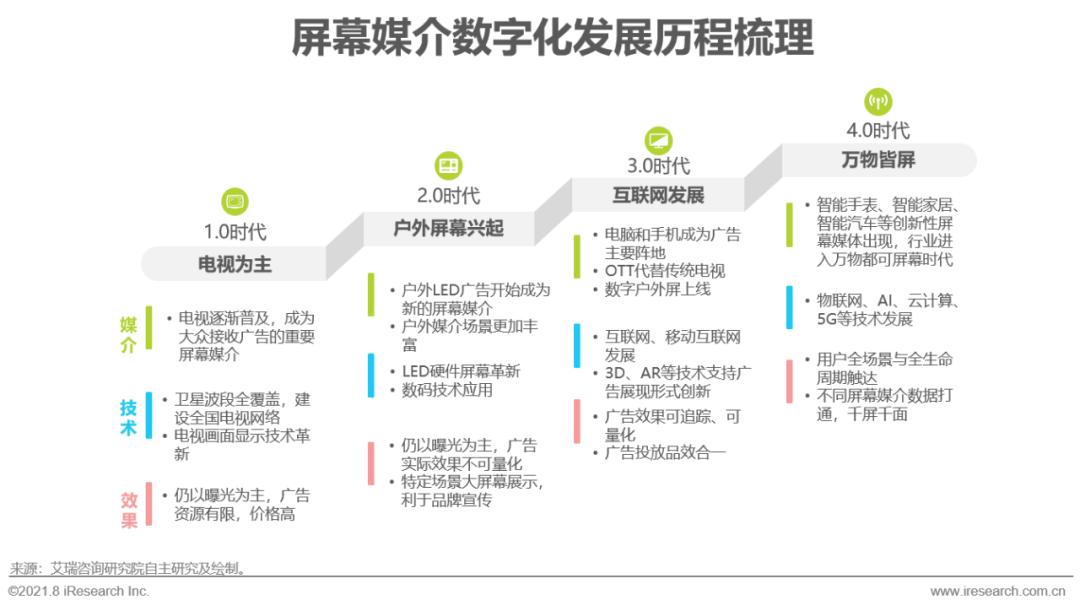 随着屏幕显示技术、信号传输技术、信息化、物联网等技术的发展,消费者在不同场景下触达的各类屏幕媒介也正在被数字化加速改造升级。从我国屏幕媒介数字化发展历程来看,在1.0时代电视借助显示技术的不断发展,成为主要的屏幕媒介;2.0时代随着数码技术的发展,数字户外屏幕逐渐兴起,但此时户外广告更多为展示性广告;在3.0时代,互联网大大加速了数字化对屏幕的渗透和改造,首先电脑和手机逐渐成为主流媒介,同时OTT开始代替了传统电视,户外屏幕广告也开始通过数字技术触网;如今我们即将进入“万物皆屏”的新时期,随着硬件和软件技术的双重发展,首先将会丰富数字屏幕载体,同时数字化技术将能够盘活不同屏幕媒介间的数据,进一步激发全场景数据营销价值,真正带来“千屏千面”、“所看即所需”的新广告体验。