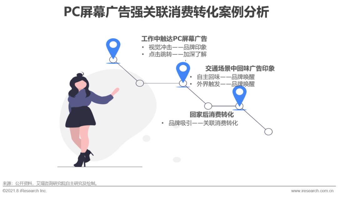 一方面,PC屏幕广告支持跳转购买链接且具备线上支付功能,有完整的用户转化链路。另一方面,PC屏幕场景化营销效果可以有效加强用户对品牌的印象,从而利于强关联消费的落地转化,如女性白领在上班期间看到PC屏幕广告,受包括广告精美度、广告互动玩法、广告内容精准度等因素影响,PC屏幕广告能够在特定场景下给其留下深刻的品牌印象,助力在其他场景中进行强关联产品的消费转化。