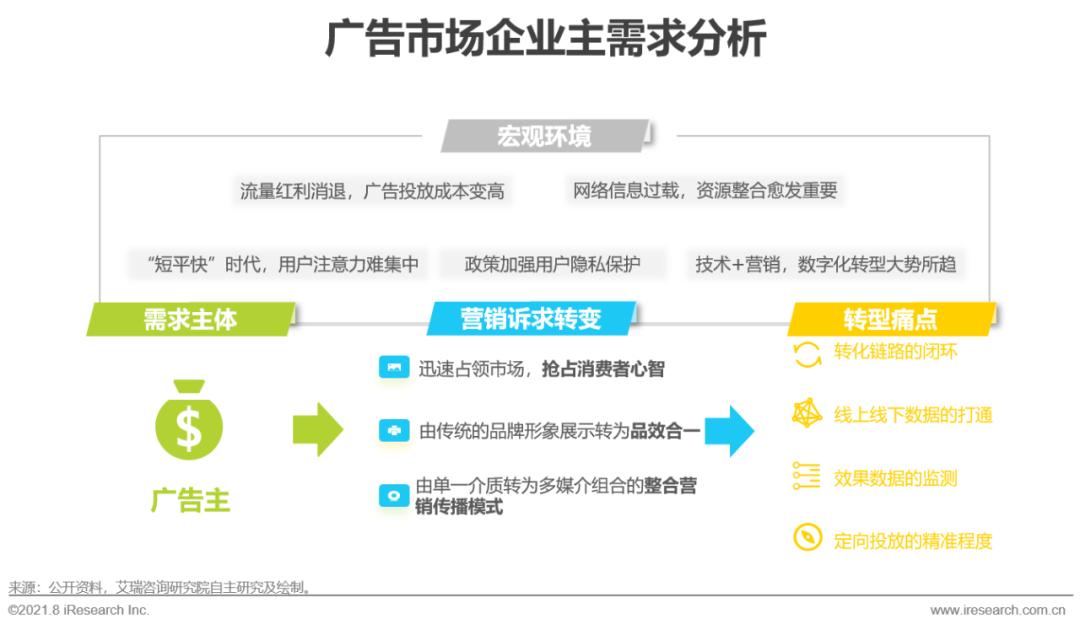 互联网市场趋近饱和,一方面带来过量的网络信息,使得广告主无效投放增多,信息资源整合的重要性凸显;另一方面线上流量红利消退,使得广告主更加重视线上线下的组合模式以及定向投放的精准程度。应对这样的营销环境,“技术+营销”的数字化转型模式愈发成为广告主的共识。广告主在转型过程中,营销诉求也在发生着改变,传统的品牌展示广告、单一介质的传播模式逐渐被淘汰,利用品效合一的组合式投放模式来抢占消费者心智成为了更多企业主的期待。