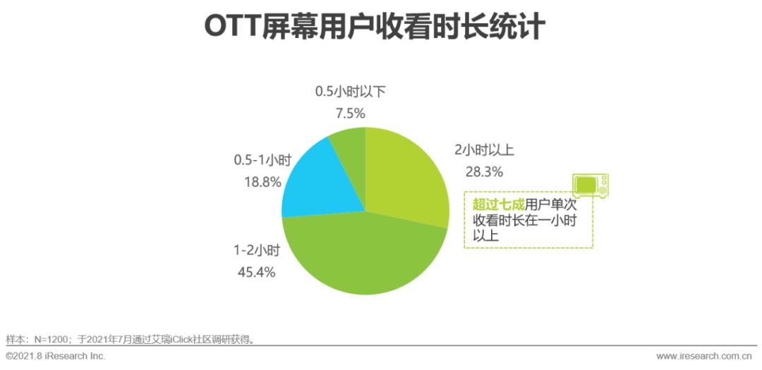 根据艾瑞咨询调研数据显示,将近一半用户有每天收看OTT的习惯,并且超过七成用户单次收看OTT的时长在一小时以上,这反映出OTT用户群体使用频次较高、时长较长的行为模式。快速增长的用户规模和庞大的用户基数为OTT屏幕广告奠定了基础,而高活跃度、强依赖性的受众群体让更多广告主看到了OTT屏幕广告的营销价值和发展潜力。