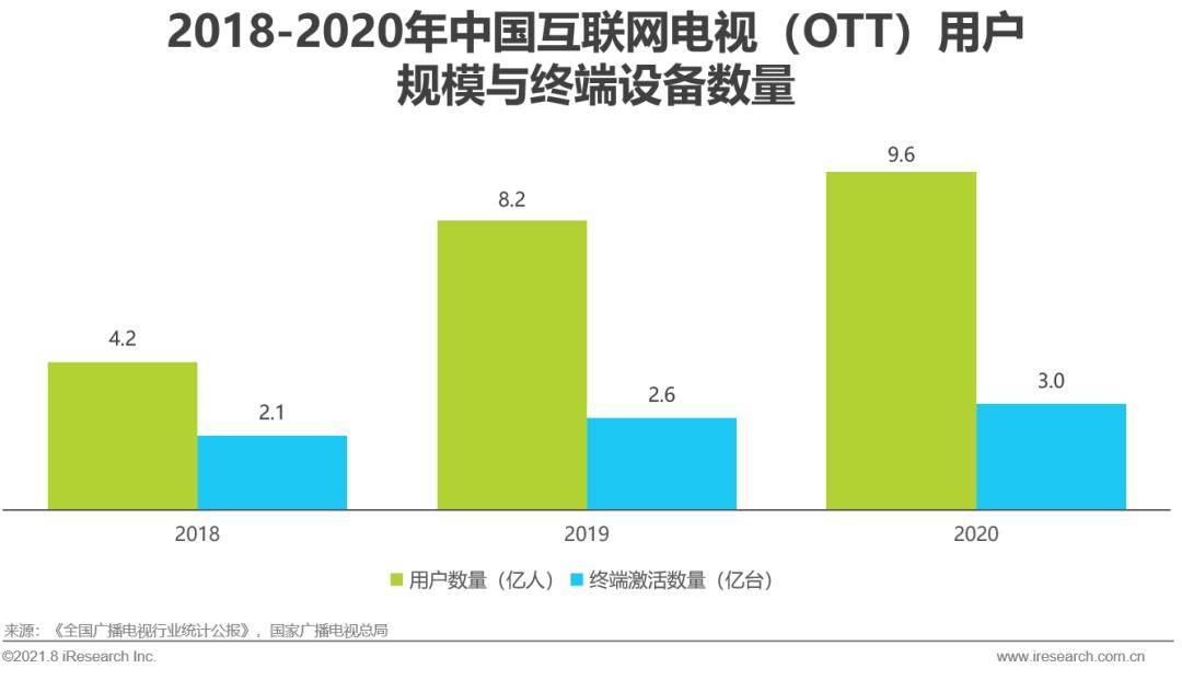 自2015年以来,国内OTT大屏电视用户数量加速增长,设备终端规模也不断扩大。截止2020年末,我国OTT电视用户数已达到9.6亿,终端激活规模约3亿台。OTT设备逐渐取代传统电视,成为很多人休闲生活中非常重要的选择。
