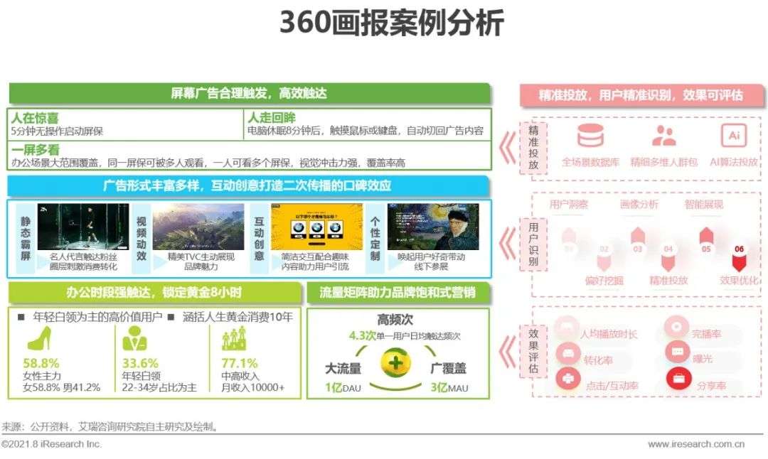 360画报支持在电脑无操作或休眠状态下开启广告轮播,对用户的打扰度低;360画报拥有多种广告展现形式,包括静态霸屏、视频动效、互动创意和个性定制等,通过打造丰富多样的广告形式和互动创意,营造广告二次传播的口碑效应;360画报在办公时段实现用户强触达,集中吸引职场人群注意力,锁定高价值人群每日的黄金8小时,且基于360流量矩阵的“高频次、大流量和广覆盖”能力,助力品牌实现饱和式营销;通过360营销技术支持,能够实现屏幕广告精准投放、用户分析和营销效果评估,满足广告主品效合一的营销诉求。
