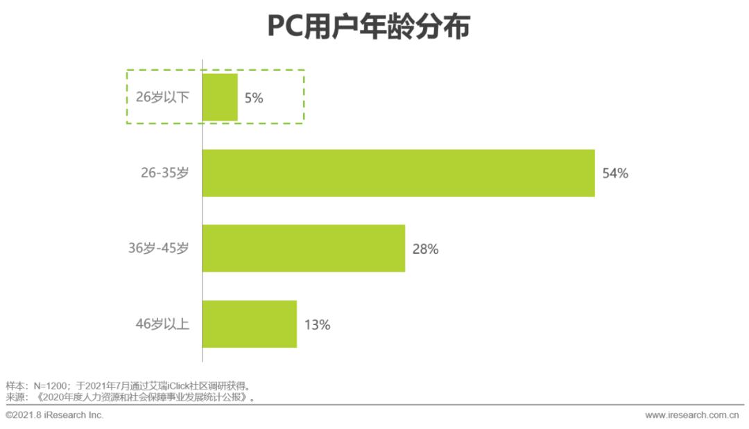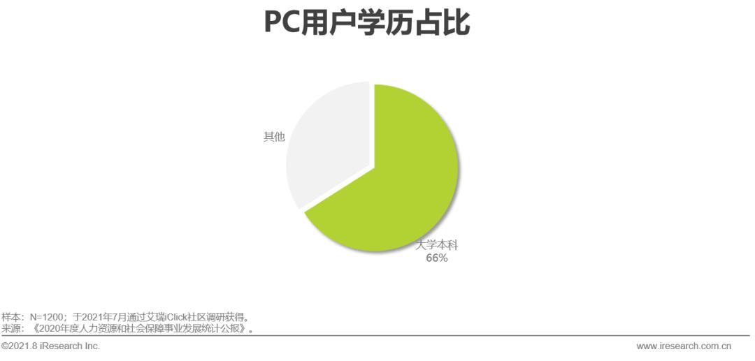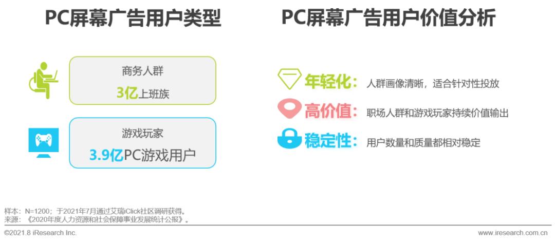 PC用户主要以商务人群和游戏玩家为主,26-35岁用户占比最高,整体用户呈现年轻化特征,其中大学本科用户比例达66%,同时商务人群和游戏玩家人群画像清晰,适合针对性投放;2020年我国城镇基本养老保险参保职工人数为3.2亿人,相当于3亿“上班族”人群,同时,根据艾瑞数据模型推算,2020年我国PC游戏用户约有3.9亿人,这两者都是PC的主力用户, 也是PC屏保广告的受众群体,该群体数量和质量都相对稳定;这两类人群也都是能够持续价值输出的高价值营销人群,未来随着PC生态不断优化用户使用体验,PC用户对硬件设备的黏性也将进一步提高。
