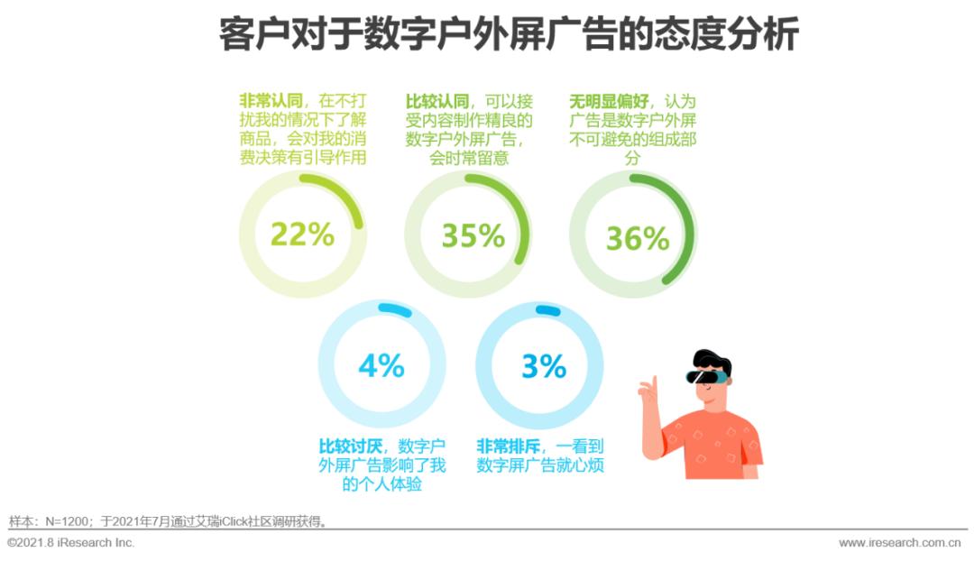 相较于其他三种类型的屏幕广告,因其投放场景与城市居民生活轨迹高度相关,受众群体对数字户外屏广告认知度最高,超过百分之九十五以上的受众都认识到这是一种数字广告形式,超过三分之一的受众对这一广告形式有过了解,仅有百分之三的受众没有接触和了解过该类型广告。在拥有高认知的同时,数字户外屏广告在受众的态度评价反馈上也表现良好。在接触过数字户外屏广告的受众群体中,只有少量用户对其产生了负面的评价(如讨厌、排斥等),大部分用户认为该类广告能够帮助自己进行消费决策或者引发自己的兴趣。
