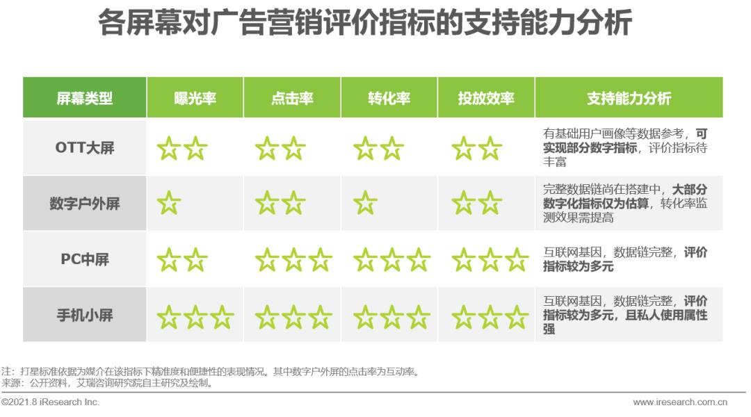 如今数字技术的应用,让营销效果有迹可循,有量化和考核标准,对媒介营销效果的量化评价也成为影响广告主选择媒介的重要因素。OTT生态近年来加速和互联网技术的融合,能够基于每个家庭的基础画像数据提供营销效果评价指标;数字户外屏正值数字化改造升级阶段,目前大部分营销数据仍为估算,其精准度有提高空间;PC和手机端因其天然的互联网基因,数据链完整,能够提供多元的营销效果评价指标。