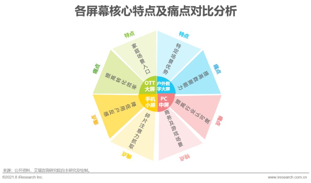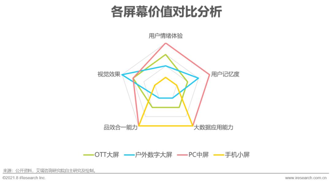 屏幕特性、所处场景、营销技术的差异化,使得基于不同屏幕的广告形式呈现出不一样的广告特点:OTT屏幕是家庭场景的高频媒介,其对家庭用户的渗透率具有明显优势;数字户外屏在特定封闭场景中具有不可替代性,适合大面积快速曝光宣传和造势,但如何利用数据技术提升精准度以及打通后链路转化是其发展的关键;PC屏保广告和手机的技术支持能力强,广告精准度更高,其中PC屏幕广告的商务及游戏场景优势突出,作为媒介其综合能力较为完备,同时,PC屏幕广告能够实时反馈,交互前置,易拆分人群,但需要提高广告主对该媒介价值的认知,而手机作为碎片化工具,用户对广告敏感度高,需要创新广告形式。