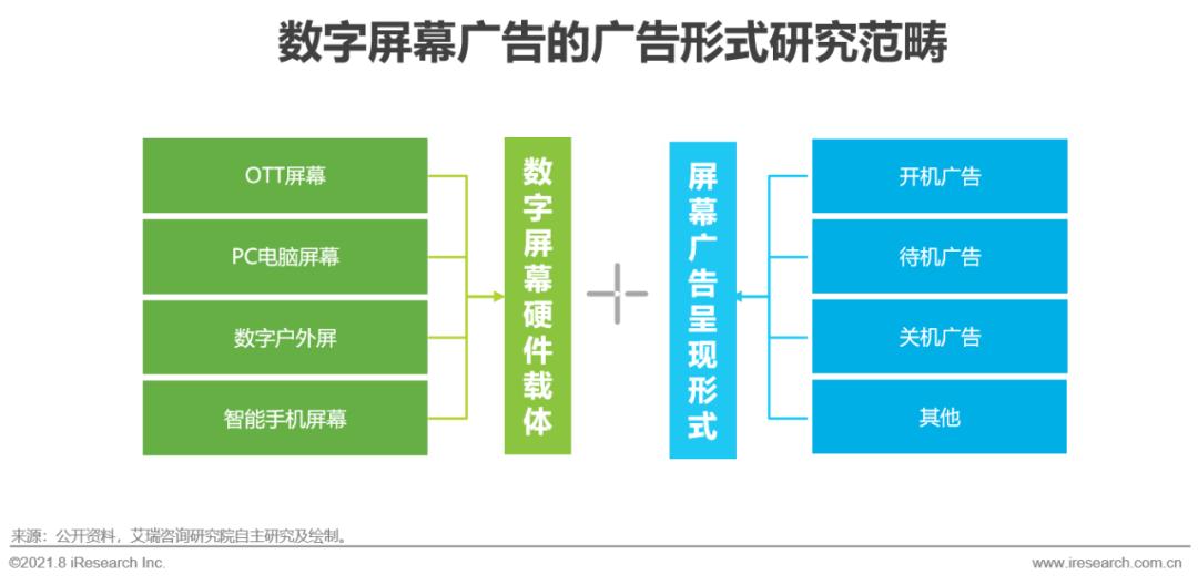 屏幕广告是指通过硬件厂商或由第三方软件等服务商植入的,呈现在终端屏幕上的广告,如开机广告、待机广告、关机广告、桌面壁纸广告,以及数字户外屏广告等。与显示在软件或媒体中的广告,和如信息流、Banner、贴片广告等媒体内嵌式广告相比,数字屏幕广告更多是基于屏幕本身形成的广告类型,以上两者是本次报告的主要研究范畴。