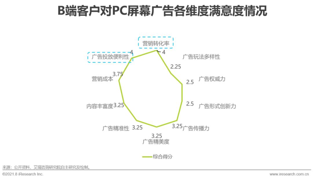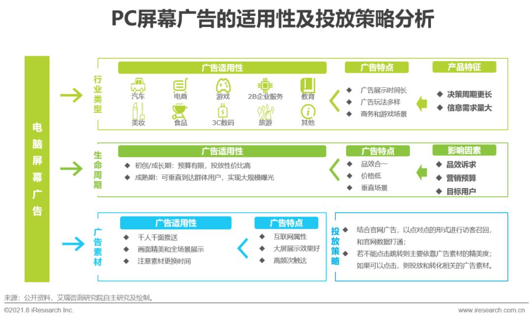 (1)PC屏幕广告可展示时间长,玩法多样,且PC屏幕广告多为商务和游戏场景,用户集中,因此较适合如汽车、电商、游戏、2B企业服务、教育、美妆、食品、3C数码、旅游及其他决策周期长,信息需求量大的产品类型。(2)PC屏幕广告因其品效合一、价格低和垂直场景可替代性弱等特点,除了成熟期企业外,也同样适用于初创期和成长期企业。(3)PC屏幕具有天然的互联网属性、大屏幕的广告展示效果好且能够触达用户的频次空间大,在投放广告素材时,需要更关注画面精美、素材更新时间等。