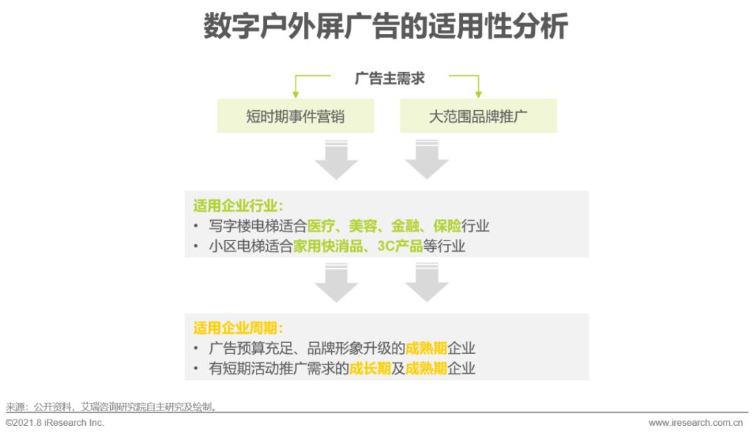 数字户外屏广告的投放位置有限,决定了其优质资源的稀缺性,也导致其投放费用远高于另外三类屏幕广告。因此,从企业生命周期上看,并不适用于资金量较小、广告投放预算有限的初创期企业;另一方面,高额的投放费用带来的是高强度曝光和高效率传播,因此更适用品牌推广与事件营销;从行业适用性上看,因为数字户外屏幕与居民生活的轨迹息息相关,能够有效圈定特定人群,如写字楼电梯广告,能够锁定部分质量较高的白领人群,就更适合投放医疗、美容、金融、保险等领域的产品广告;小区电梯广告,能够抢占部分家庭消费群体,更适合家用快消品、3C产品等行业。