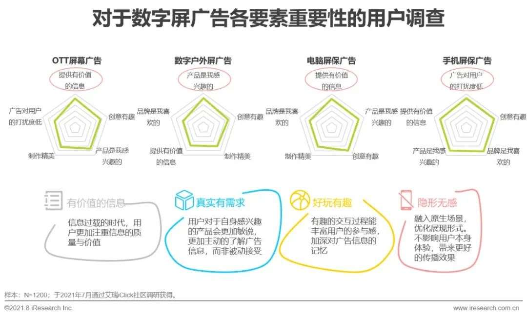 从用户调研数据来看,用户对手机屏幕广告的负面认可度高于用户对总体屏幕广告的认可度,用户对手机屏保广告的认可度低,同时用户对手机屏幕广告低干扰度的诉求更强,未来如何创新手机屏幕广告的形式和玩法,解决对用户的干扰性问题将是行业的重点课题。