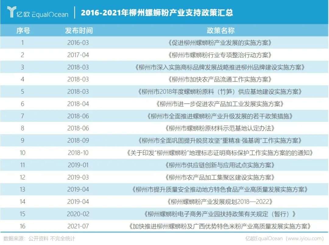 据不完全统计,2016-2021年,柳州市出台的与支持、鼓励螺蛳粉产业的相关政策多达16项,包含支持买地、建厂房、引进物流快递、优化电商产业配套设施等。