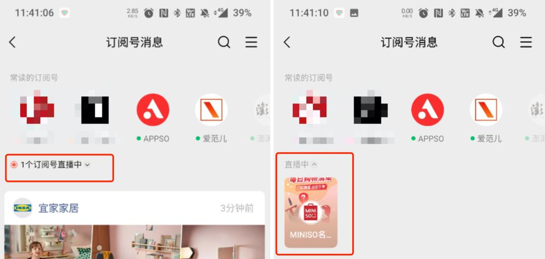 现在流量扶持力度加大,用户在点进订阅号界面时即可看到目前正在直播的订阅号直播卡片。最近这部分卡片还支持折叠,不想看直播卡片提示的用户点击小三角符号即可折叠所有卡片。