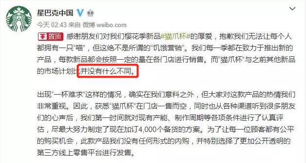 2019年,星巴克曾推出樱花系列杯,其中一款猫爪杯异常火爆,当天就销售一空,原价199元的杯子被炒到千余元。面对这一前所未有的情况官方迅速反应,在其声明中明确表示:“猫爪杯与之前其他新品的市场计划并没有什么不同。”