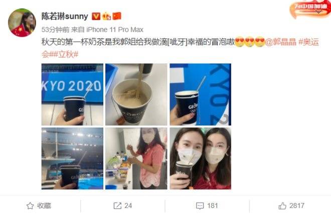 另外,这个梗能够再次被激活,奥运明星也功不可没,“跳水女皇”郭晶晶给同是东京奥运会跳水裁判的陈若琳亲自做的一杯奶茶,立秋当天一早在陈若琳官方微博上晒出,并延用了去年的热梗:“秋天里的第一杯奶茶”,成就了一段为人称道的中国体坛嘉话。可以说,今年立秋遇上东京奥运会,在奥运明星轻而易举又唤醒了人们对立秋第一杯奶茶进行“心意消费”的热情。