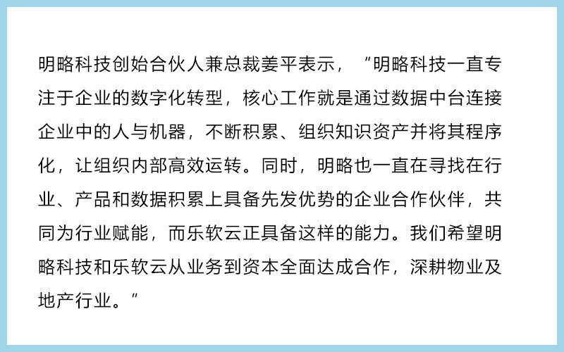 在物业及地产数字化服务领域,要面临从区域到全国范围不同层面的竞争,既有明源云这样的头部上市公司,也有大量的创业公司,甚至还会有免费的SaaS服务。面对复杂的竞争态势,乐软云创始人楚季表示:1)通过产品不断迭代升级,增强客户数据的沉淀,构建数字化服务的数据壁垒,进一步提升客户复购率;2)对于处于头部的KA客户,服务能力是核心,乐软云和明略科技深度合作的智能服务平台,为物业及地产领域带来了数字化核心能力的提升;3)相对于国内巨大的市场空间,目前数字化转型还处于早期阶段,乐软云希望和同业公司一起为客户提供更有价值的产品。