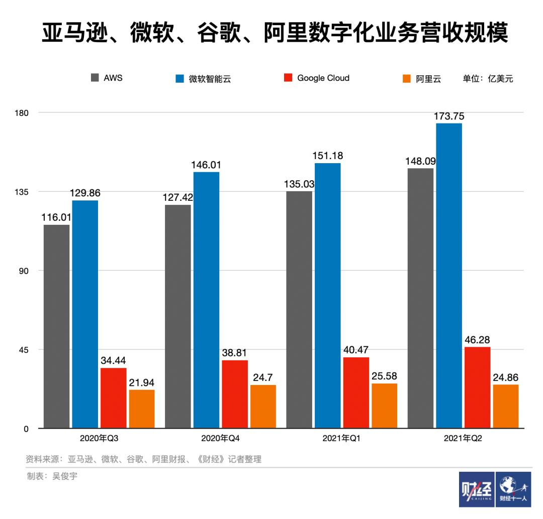 亚马逊、微软、谷歌增长快速平滑,且保持着可观利润。核心原因在于,欧美市场历史悠久,数字化进程长达20年余年,生态完善度远超国内。IBM 、Salesforce、Oracle等IT企业以及PaaS、SaaS等细分领域的软件企业已相当成熟。良性的竞争合作不仅可以做大蛋糕,还带来了可观的利润,足以投入下一代技术研究。这种环境下,良性循环得以建立。