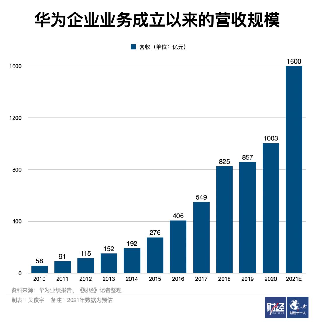 华为企业业务目前相对稳定,但供应链还是有受国际环境影响的风险。作为华为业务增长的压舱石,华为对该业务板块的增速要求更高。今年5月,《财经》记者从华为方面得到的数据是,2021年企业业务收入目标为1600亿元。如果目标不变,这意味着华为企业业务下半年营收要达到1171亿元,这看起来显然非常不容易。