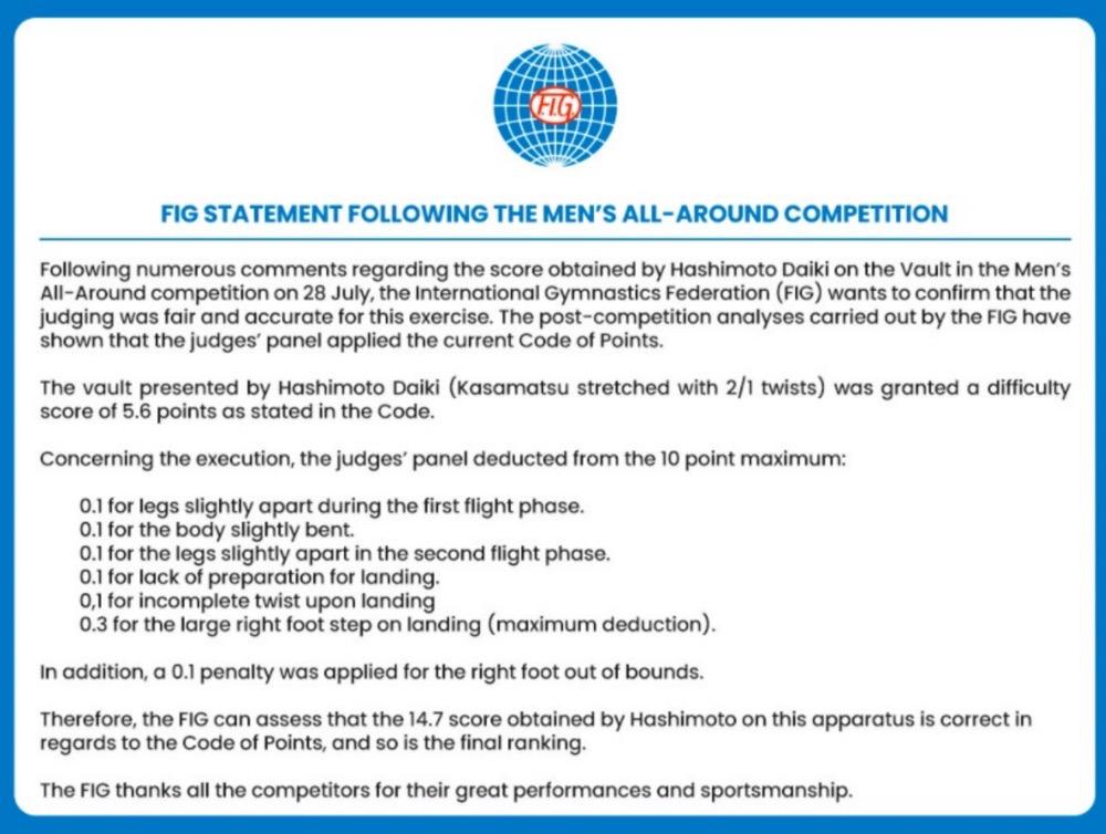 除了文化理念上的不同,比赛中还有一些引起争议的现象。比如引发了全网热议的体操男子个人全能决赛,日本选手桥本大辉落地出界却拿到了金牌。