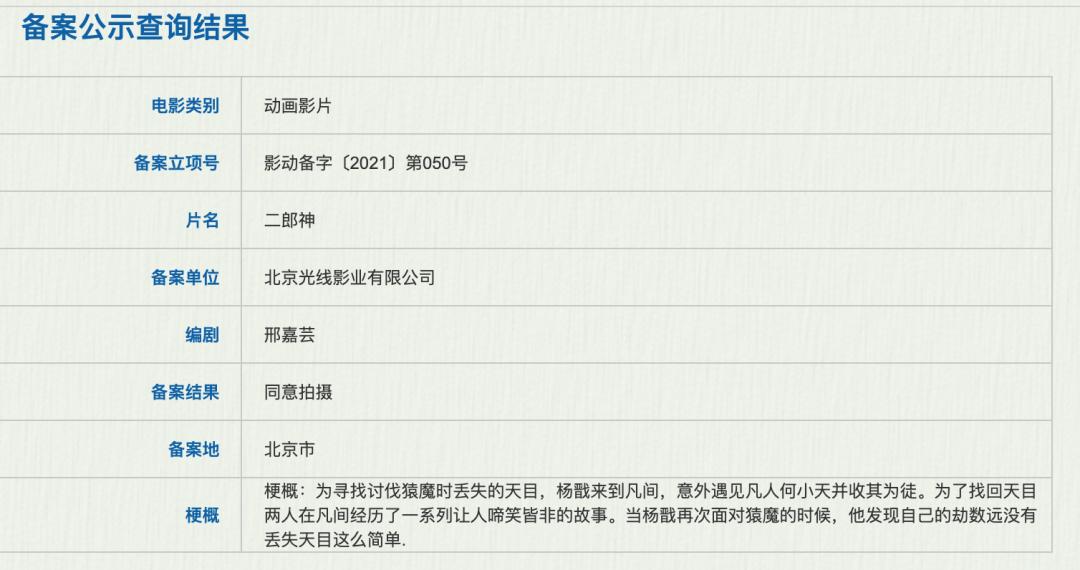 《新神榜:杨戬》是追光在今年1月份备案公示,国家电影局已同意拍摄。