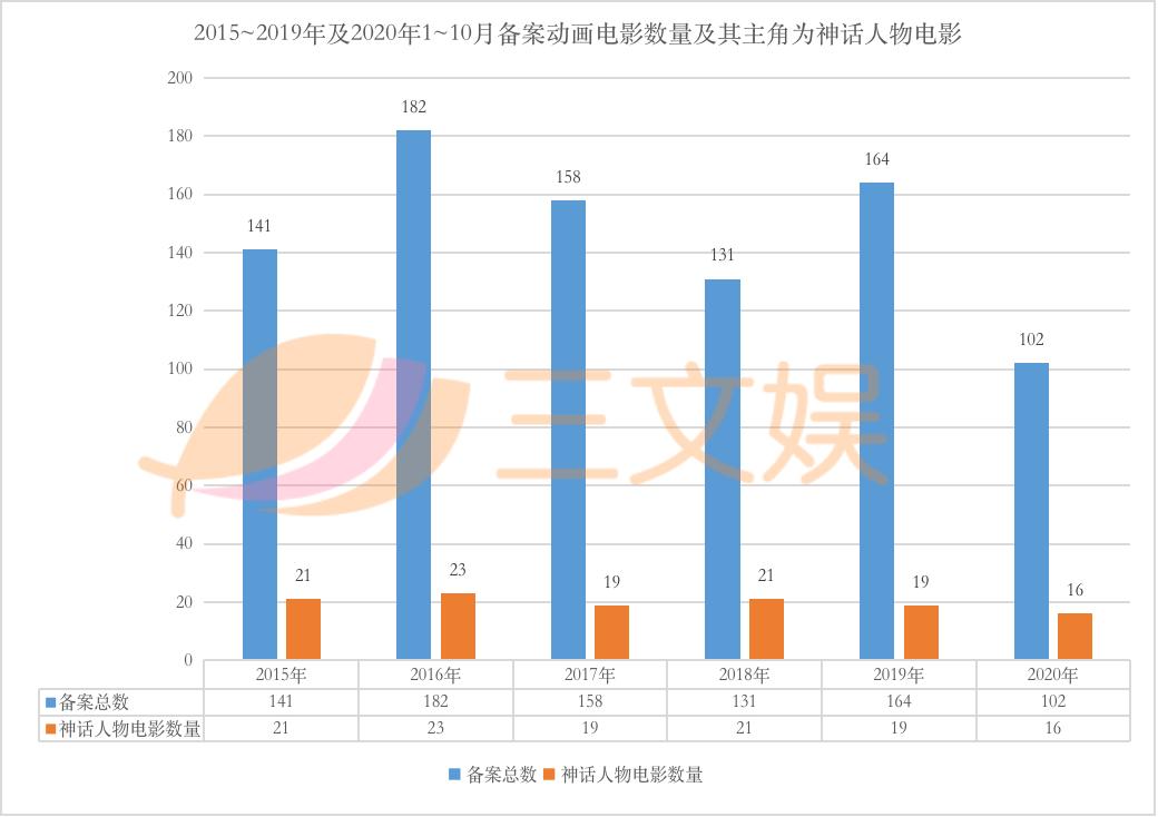 在统计2015~2020年备案国产动画电影的时候,三文娱也统计了其中基于中国经典神话人物IP改编动画电影的备案数量。过去5年里,这类作品的数量至少有119部,包括24个孙悟空11个哪吒……