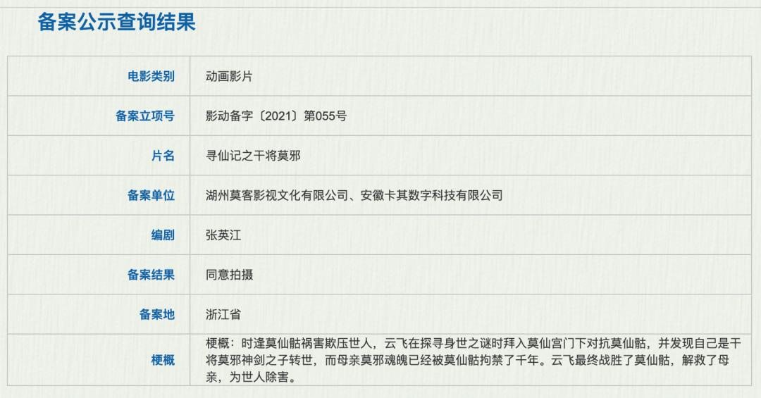 另一部2021年备案的,神话人物干将莫邪相关的国产动画电影是《干将莫邪神剑》,铸剑影业备案,张英江为本片编剧。
