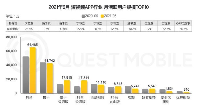 根据QusetMobile TRUTH中国移动互联网数据库显示,2021年6月,抖音的月活达到6.45亿,快手位居第二,月活达到4.12亿,而微视的月活还不足6000万,排在其前列的还有快手、抖音的极速版、西瓜视频和抖音火山版。