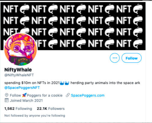 NiftyWhale 曾撰写过一篇自我介绍,简略交代了自己的背景:他是一个连续创业者,财务自由后成为天使投资人;自 2020 年 11 月起便一直在收集 NFT,2021 年 3 月创建了 Nifty Whale,以支持艺术家、创作者和 NFT 社区,目前累计在 NFT 上花费 1000 万美元。