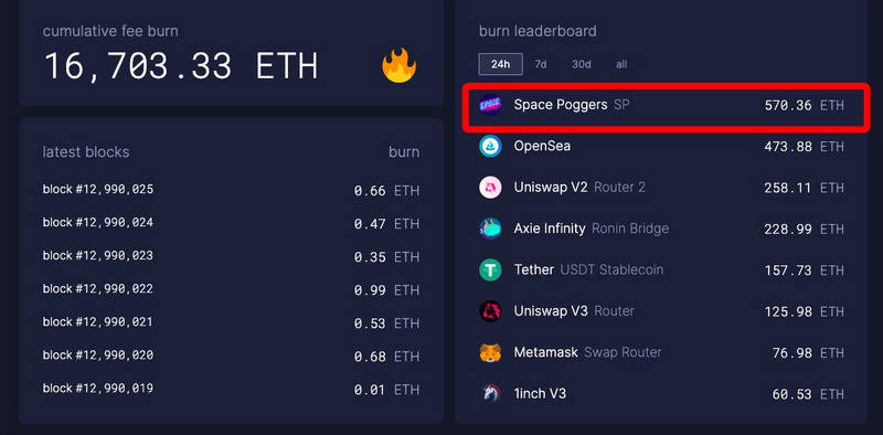 Ultrasound.money 数据显示,该项目地址目前累计销毁量达到 570 枚 ETH,排名第一,超过 OpenSea 地址(473 枚 ETH )。在 OpenSea 网站上,Space Poggers NFT 目前最低最低成交价为 0.19 ETH,是初始价格的 2.7 倍;上线不到 24 小时,累计交易量达到 405 个 ETH。
