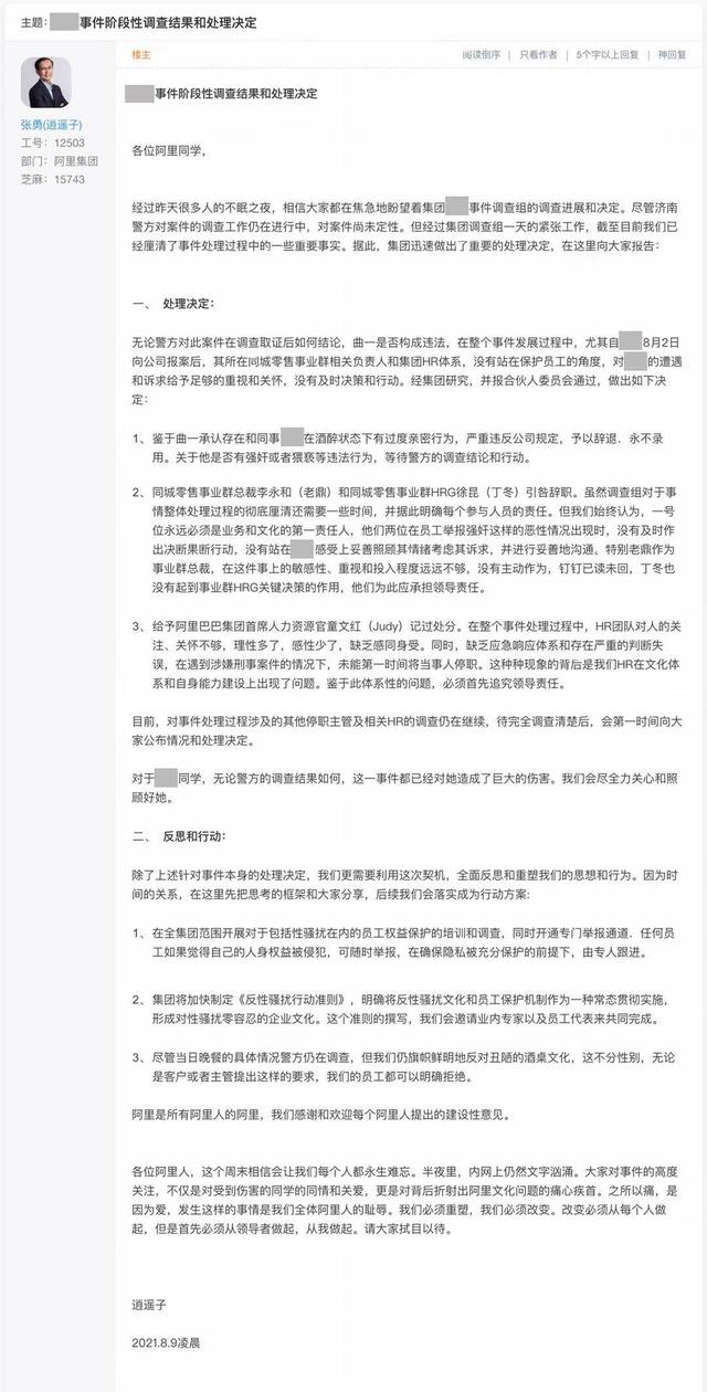 此前,8月9日凌晨5点半,阿里巴巴董事会主席兼CEO张勇在阿里内网公布了“女员工被侵犯”的阶段性内部调查结果和处理决定:同城零售事业群总裁李永和和HRG徐昆引咎辞职,阿里巴巴首席人力资源官童文红记过处分,涉嫌男员工王某文被辞退,永不录用,其是否存在违法行为,警方正在调查取证。