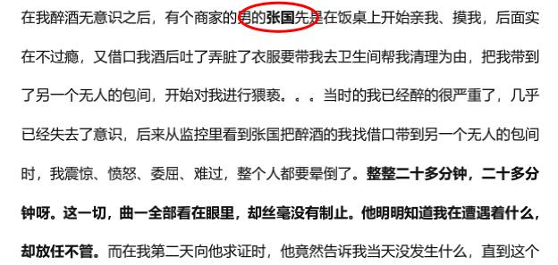而且根据阿里女员工自述的说法,张国其实比王某文还要更早,并在酒桌上当着酒桌上其他人,公然第一个对阿里女员工实施了猥亵行为。而且根据女员工的自述内容来看,女员工遭遇这场酒局的侵害,来自王某文要“送美女”给华联的合作方。具体指向的人,就是这个张国。