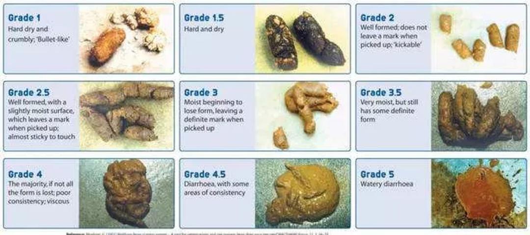 根据国外宠物营养与健康研究网站的说明,Grade1.5-2.5这三种便便的形状和干湿度都是健康的状态。