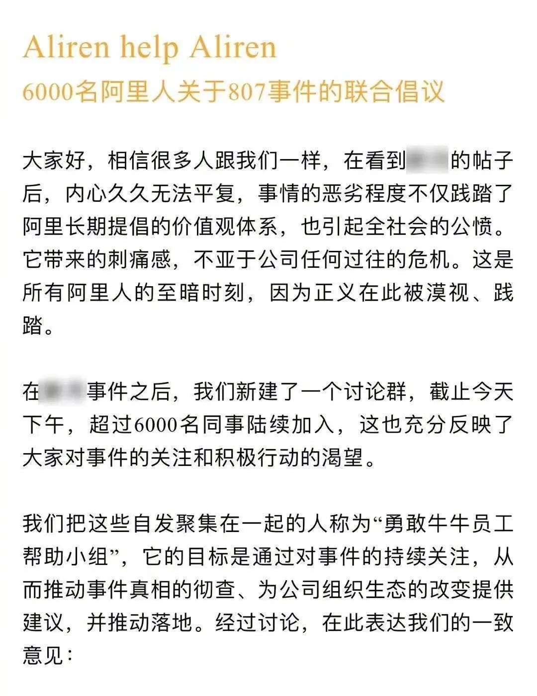 在阿里内部,员工也开启了自助。一个名为"勇敢牛牛帮助小组"的讨论组在8月7日当晚成立,目标是对事件的持续关注,从而推进事件真相的彻查,为阿里组织生态的改进提供建议。截至到8月9日,成员已经超过6000名,他们发布了《关于807事件的联合倡议》,其中,对女性员工职场反性骚扰、反性侵制度的建立,提出了具体诉求。