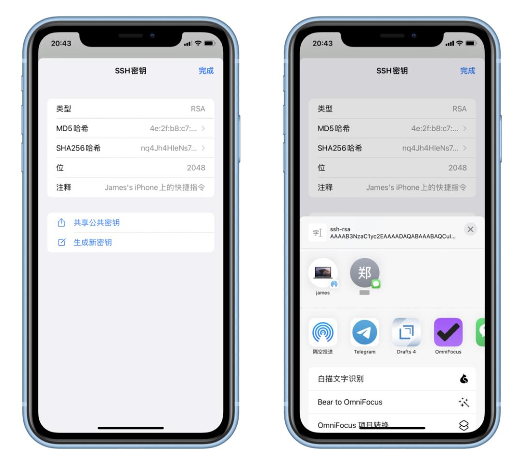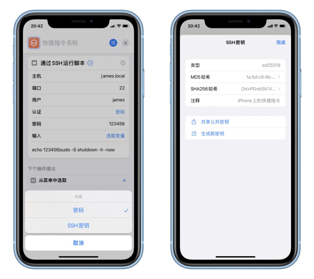 在上一步,作者使用密码作为验证访问 Mac。但是这样做,轻则暴露密码长度,重则直接暴露密码,所以可以考虑使用密钥验证。点击「认证」选择「SSH 密钥」,捷径就会生成 SSH 密钥以供使用。